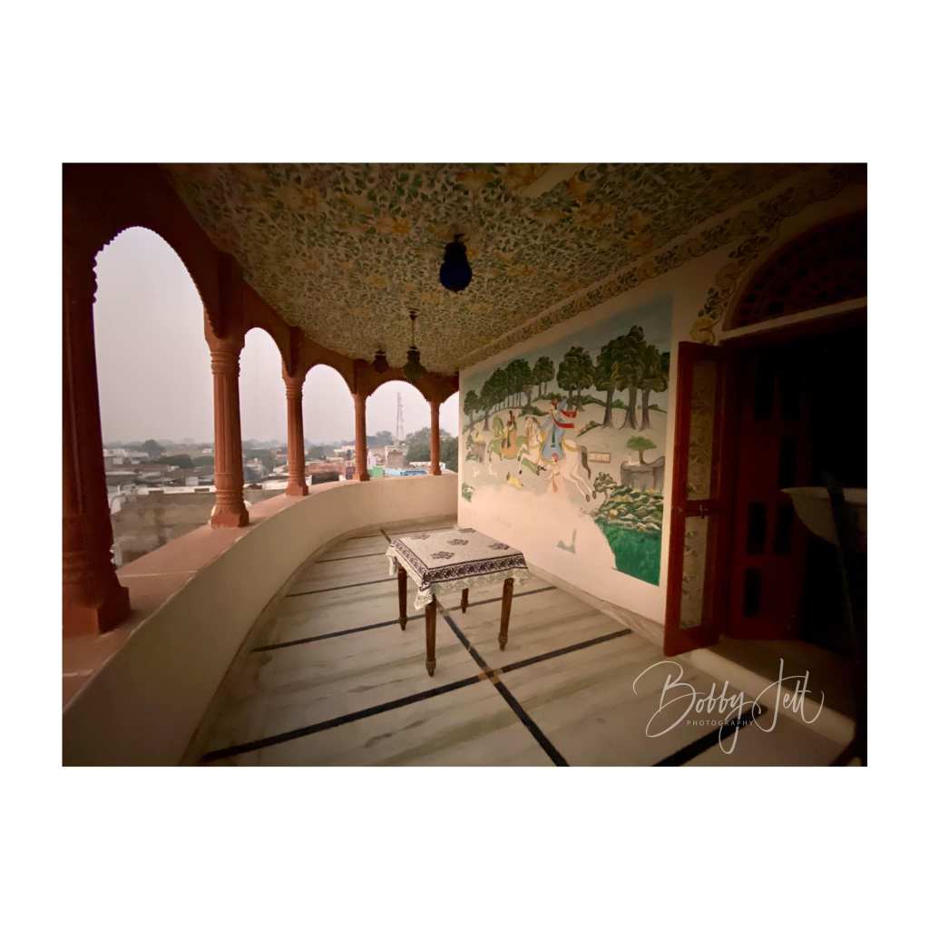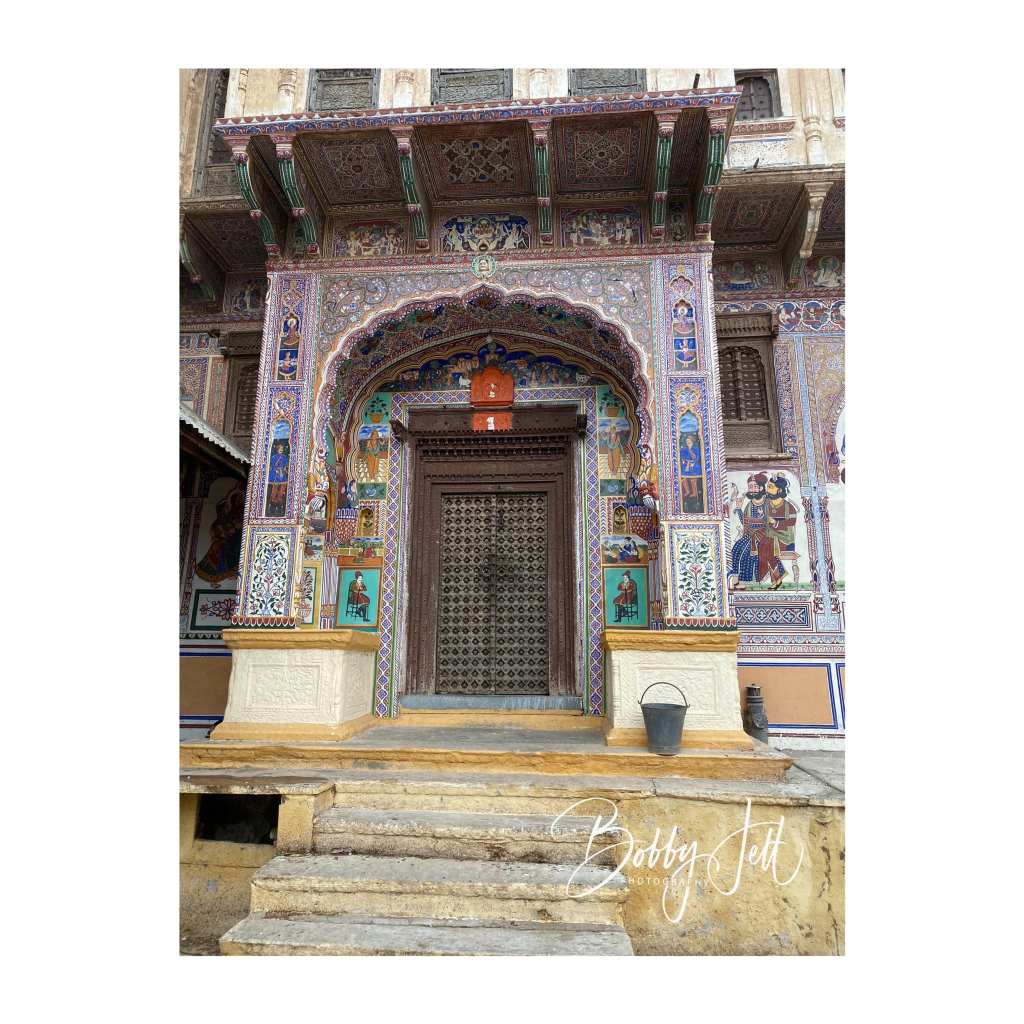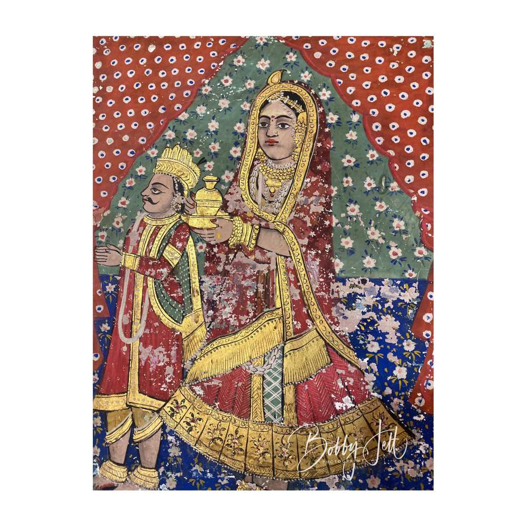 MANDAWA is located in the Shekhawati region of Rajasthan and is known for its many colorful havelis. I had a fantastic tour guide with the name of Om. He spent a half day with me exploring the small village with its many havelis. A few of the most colorful havelis were the Binsidhar Newatia and Murmuria havelis. Scores of havelis in this small village decorated their exterior and interior walls with hand painted scenes from their travels, and depictions of various guests who had passed through the walls. The havelis had three areas: the first was used as a business area to sell wares. This area was the most heavily decorated and served as a way to make an impression of guests and assure them of the success of the business. The second courtyard was used to house children and the elderly. There was also a large square open area in the middle of the second courtyard used to catch rainwater. The third courtyard, and highest in the haveli were used to house the owners of the house.
